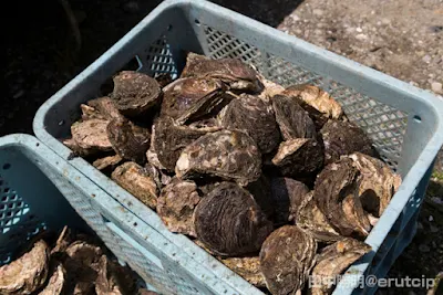 中田さんの話だと、高鍋のかきは江戸時代から知られていたようで、高鍋藩主が食したという記録も残っています。中田さんが組合長を務める高鍋町カキ生産組合には、現在8軒が加盟。保護区域や漁期を設定したり、採取量を1日60kgに制限するなどして、蚊口浜が誇る天然資源としてのかきを保護しています。