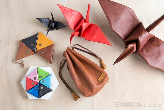 ●鹿革クラフト:鹿革の特徴を生かした小物を作る高山さん。小銭入れやバッグ、柔軟さを最大限生かした「オリガワ」(写真下)などを手掛けます