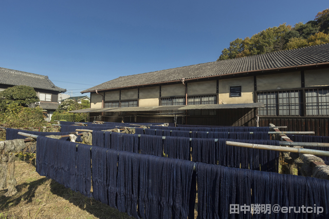 のこぎり屋根の織物工場の外には、深い藍色に染め上げられた糸が干されていました。