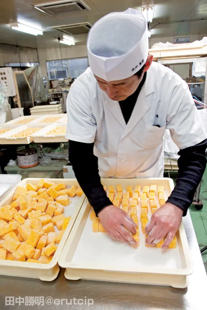 とは、代々松浦家御用菓子司を務めたつたや総本家の松尾俊行さん。当時では贅沢な砂糖や卵がふんだんに使われており、明治に入るまで位の高い人しか食べることが許されませんでした。カステラを切り分け、卵黄にくぐらせ、糖蜜に浸け、更にグラニュー糖をまぶして作ります。材料を聞くと「甘過ぎるのでは」と心配になりますが、意外にさっぱり上品な甘さでした。